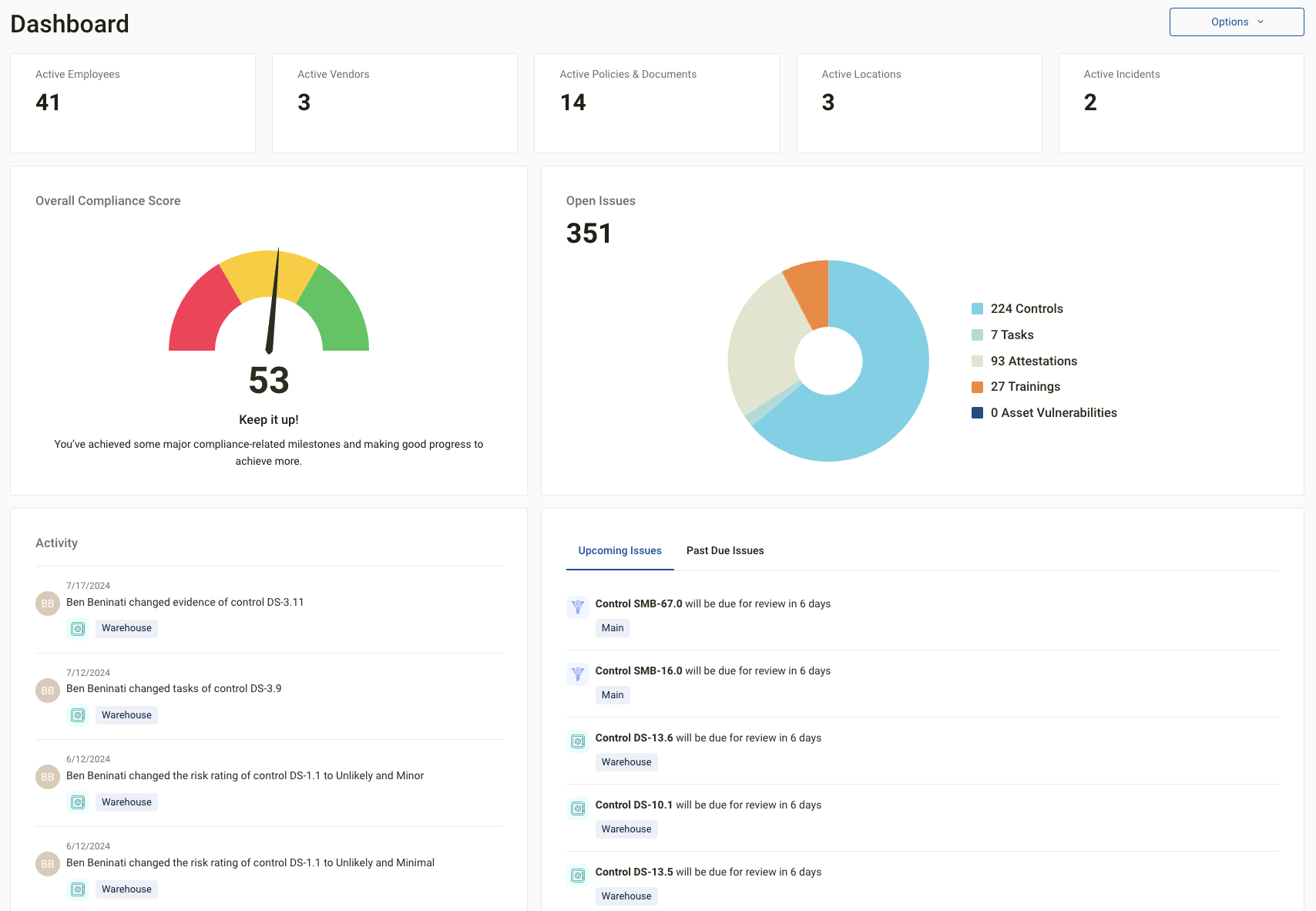 - Open Issues – Total number of open tasks, trainings, and vulnerabilities across all modules. Updates in real time.