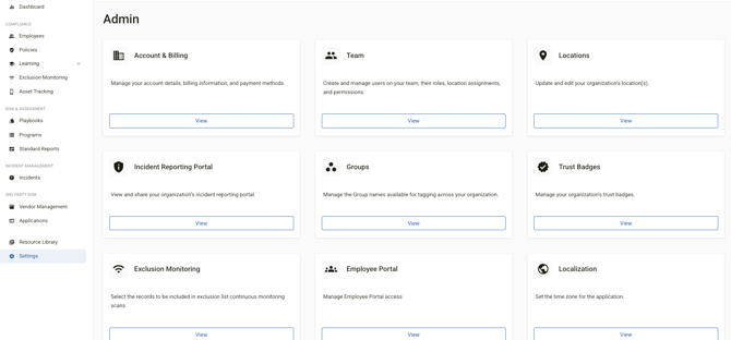 The Account & Billing section in The Guard allows admins to view and manage invoices, pay outstanding balances, modify their subscription plan, and purchase employee seats or additional premium course tokens — all directly within the platform.